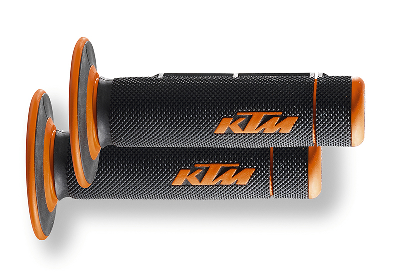 Der KTM 2K (2K = zwei verschiedene Materialien) Griff kombiniert die Haltbarkeit der KTM Standardgriffe mit dem Komfort der weichen KTM Griffe. - Härteres oranges Material an der Innenseite und an den Griffenden für lange Haltbarkeit - Weicheres schwarzes Material auf der Außenseite, wo die Hand auf dem Griff liegt, für erhöhten Komfort