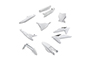 Originalverkleidungsteile, ohne das Seriendekor, Optimale Basis zum Erstellen eines einzigartigen Designs, Perfekte Passform, Personalisiere den Look deines Motorrades Bestehend aus: Gabelschutzkit, Kotflügel, Luftfilterkasten-Deckel, Luftfilterkasten-Wand, Seitenverkleidung, Startnummerntafel, Spoilerset, Heckteil Alle Teile in einem Karton verpackt.
