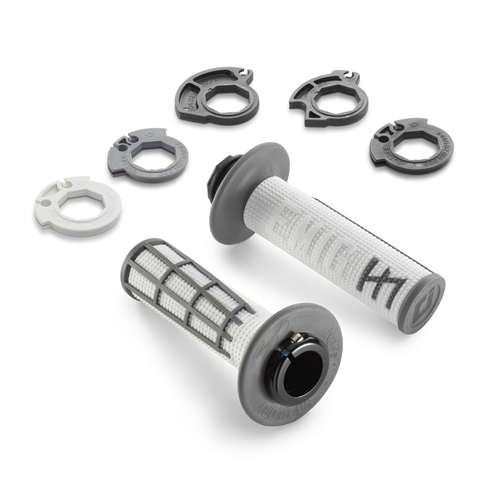 Rechter Griff fix am Gasdrehgriff verklebt. Linker Griff mit Aluminium-Klemmring zum Fixieren am Lenker. Kein umständliches Verkleben und Sichern mit Draht mehr notwendig. Durch die verschiedenen Kulissen kann die Geschwindigkeit der Drosselklappenöffnung verändert werden.