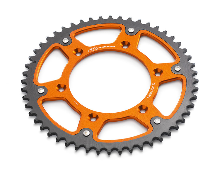 Wenn du höchste Qualität und Leistung suchst, sind diese Kettenräder das Richtige für dich! - Zähne aus hochfestem Stahl, für eine extra lange Lebensdauer - Mittelteil aus Aluminium, reduziert die ungefederten Massen - Durch hochfeste Nieten permanent miteinander verbunden - Mindestens dreimal höhere Lebensdauer als andere Aluminium-Kettenräder - 50% leichter als herkömmliche Kettenräder aus Stahl Weiterer Vorteil: längere Lebensdauer des gesamten Antriebssatzes Exklusiv hergestellt für KTM durch Supersprox. Dieses Produkt ist durch folgende Patente in der EU und den USA geschützt. EU Patent # EP1573234. US Patent # 7.481.729. Patent Inhaber Supersprox a.s.