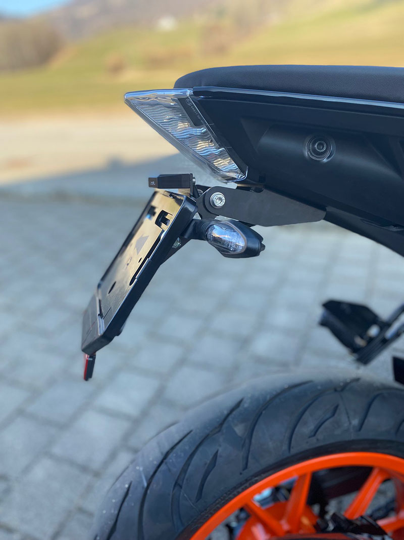 Lieferant: MG BIKETEC. Kurzer / kompakter & stylischer Kennzeichenträger mit Blinkerhalterung • Voll verstellbarer Nummerntafel-Winkel & Blinkeraufnahme • CNC gefräste Aluminiumkonstruktion • Strapazierfähige matt-schwarz eloxierte Oberflächen • Kompatibel mit originalen oder vielen M10 anschluss Zubehörblinker • Verbesserung der gesamten Motorrad-Ästhetik • Integrierte LED Kennzeichenbeleuchtung und Reflektor - beide mit ECE Kennzeichnung • Leicht zu montieren, - nur Trennung eines Steckers notwendig